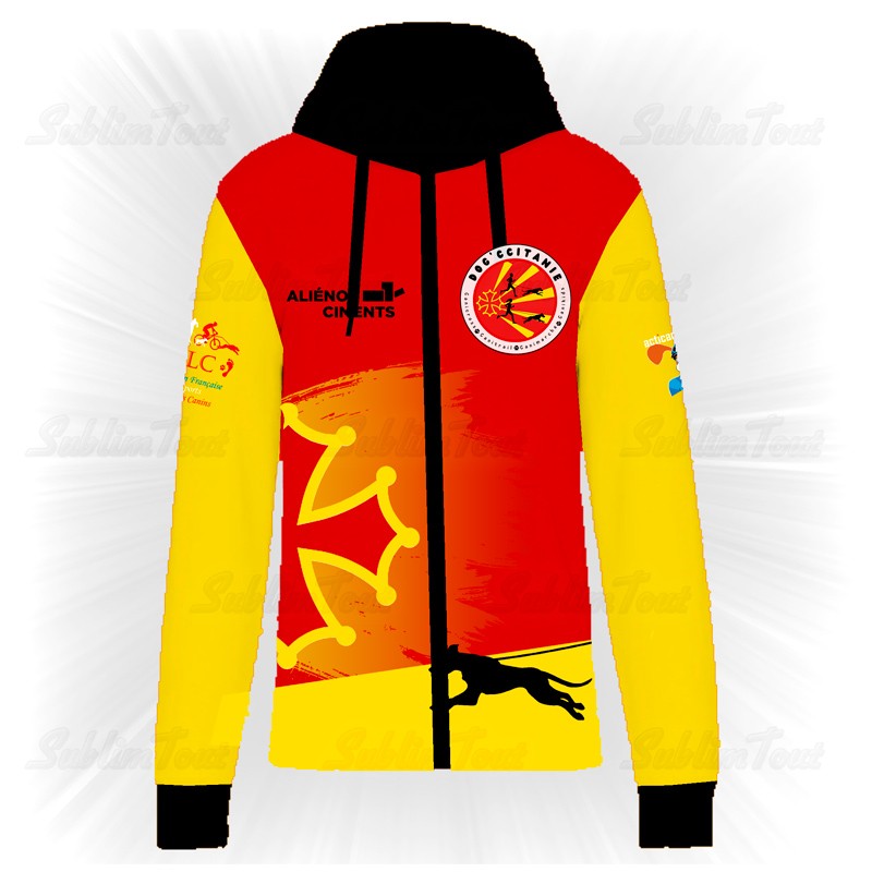 Sweat à capuche zippé unisexe adulte entièrement aux couleurs des Dog'ccitanie.