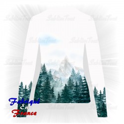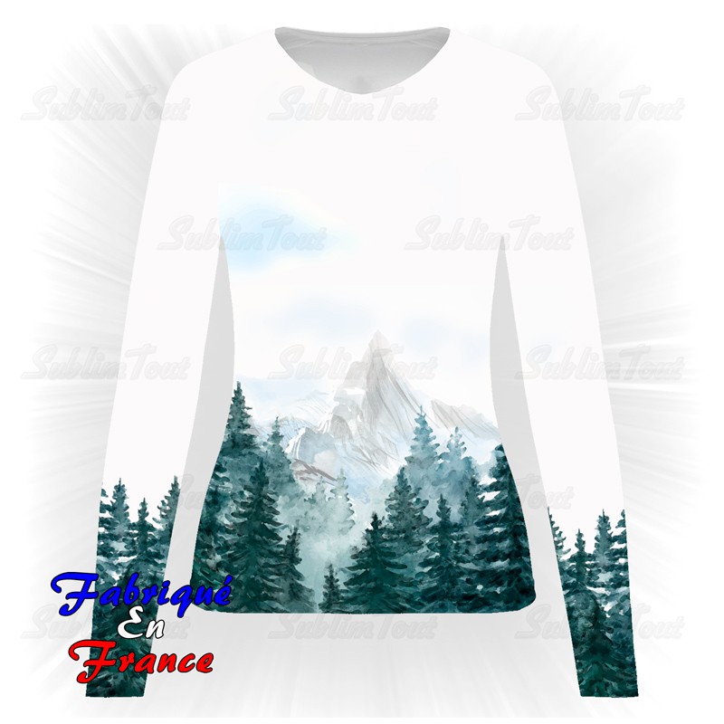 Tee shirt manches longues entièrement personnalisé sur le thème des montagnes et des sapins.