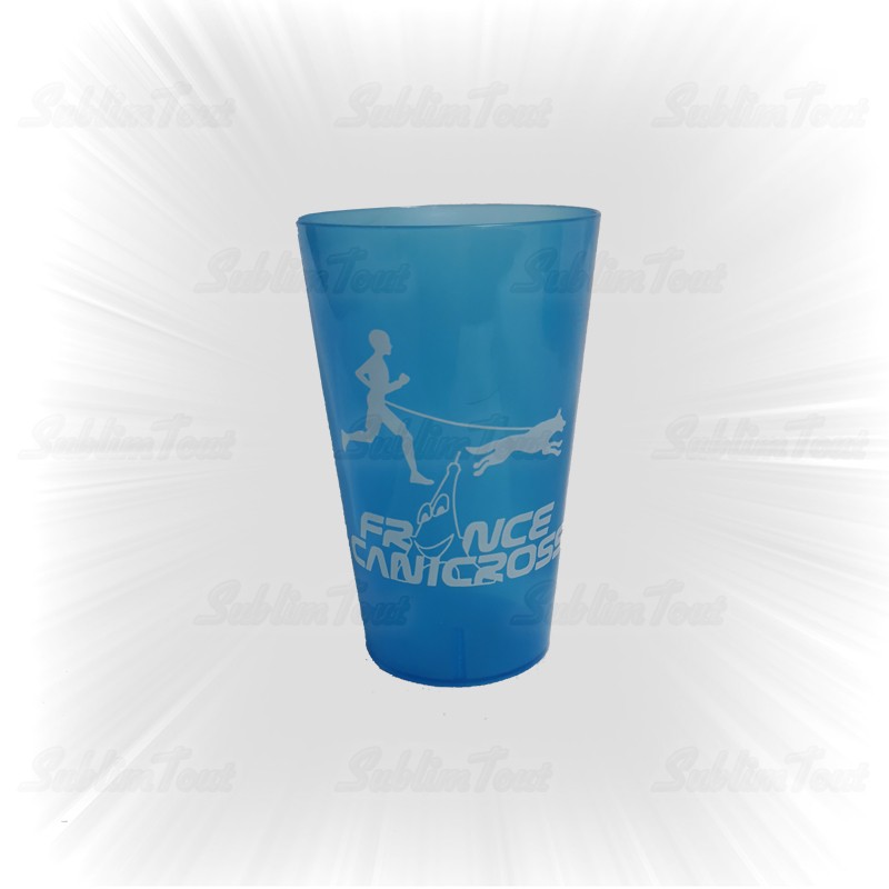 Le gobelet sera bleu turquoise avec le logo France Canicross en blanc.